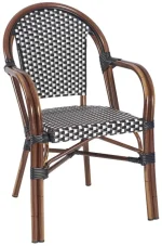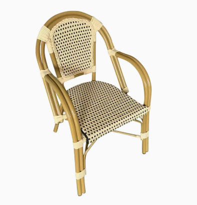 CHAISE STYLE BISTROT PARISIEN AVEC ACCOUDOIRS- Dimensions : 88 cm x 57 cm x 56 cm (H x L x P)- Matériel : Aluminium et rotin synth